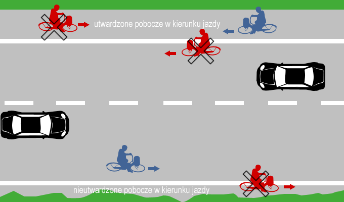 Rowerzysta z zasady zobowiązany jest do poruszania się po jezdni, gdzie jest pełnoprawnym uczestnikiem ruchu. Wyjątkiem jest sytuacja, w której istnieje utwardzone pobocze, bo wtedy rowerzysta ma obowiązek jechać po nim oraz infrastruktura dla niego przeznaczona. W drugim przypadku jednak droga dla rowerów lub pas ruchu dla rowerów muszą być wyznaczone dla kierunku w którym jedzie lub zamierza skręcić. Oczywiście rowerzysta nie może poruszać się po drogach ekspresowych i autostradach, a także tam gdzie ustawiony został znak zakazu wjazdu rowerów (B9), chyba, że jest pod znakiem znajduje się tabliczka nie dotyczy rowerów (T-22).