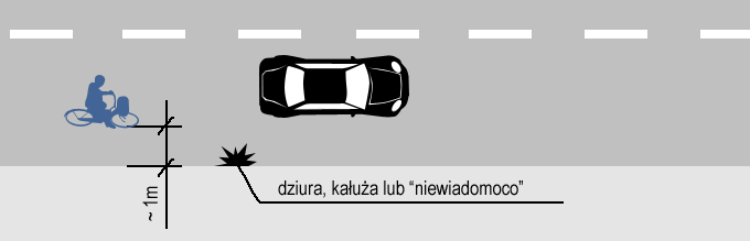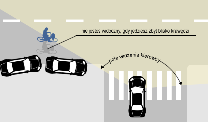 Pozycja na drodze zbyt blisko prawej krawędzi jezdni. Jadąc wzdłuż parkujących samochodów rowerzysta powinien brać pod uwagę, że każdy z nich może nagle otworzyć drzwi lub ruszyć, zajeżdżając mu drogę. W przypadku parkowania tzw. ukośnego lub prostopadłego, rowerzysta musi szczególnie uważać na cofające (opuszczające parking) pojazdy oraz tylne drzwi samochodów typu kombi lub van, które są słabo widoczne a otwarte - znajdują się na wysokości głowy rowerzysty. Nierówności na drodze mogą powodować utratę równowagi lub konieczność szybkiego skrętu w lewo, co grozi zderzeniem z innymi pojazdami. Jeśli nie parkują samochody, rowerzysta może też zaczepić pedałem o krawężnik. W takich przypadkach rowerzysta powinien jechać „szeroko” - daleko od krawędzi jezdni. Podobnie „szeroko” rowerzysta powinien jechać jeśli samochody parkują przy krawędzi jezdni w dużej odległości od siebie, np. co kilkadziesiąt metrów. Wjeżdżając między nie rowerzysta (np. żeby ułatwić jadącym za nimi samochodom wyprzedzanie) zakłada pułapkę na samego siebie. Przed kolejnym parkującym samochodem będzie musiał wjechać „szeroko” na jezdnię, co może zaskoczyć kierowcę samochodu jadącego tuż za nim. Rowerzysta zawsze powinien jechać możliwie prosto, w stałej odległości od krawędzi jezdni.