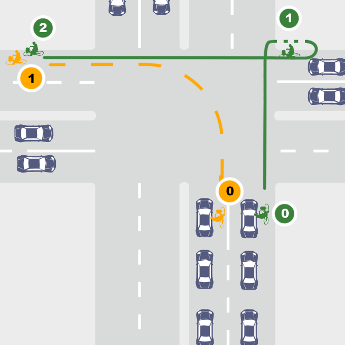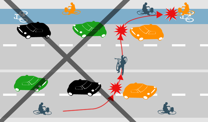 Skręt w lewo z jezdni z pierwszeństwem lub na zielonym świetle (zwłaszcza w przypadku jezdni wielopasmowych). Jest to manewr potencjalnie niebezpieczny, często niewygodny i trudny do wykonania, zwłaszcza na szerszych ulicach z dużym i szybkim ruchem samochodowym. Rowerzysta „zajeżdża” drogę szybko jadącym na wprost samochodom i często ma trudności z oceną szybkości i odległości znajdujących się za nim pojazdów. Planując trasę, należy unikać skrzyżowań na których trzeba skręcić w lewo z ruchliwej jezdni, zwłaszcza o dwóch lub więcej pasach ruchu. Skręt w lewo jest bezpieczny tylko jeśli pojazdy muszą się zatrzymać na podporządkowaniu (nie na światłach – rowerzysta może trafić na zielone!) oraz na małych rondach jeśli rowerzysta jedzie na nich środkiem pasa ruchu.